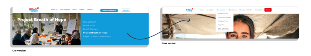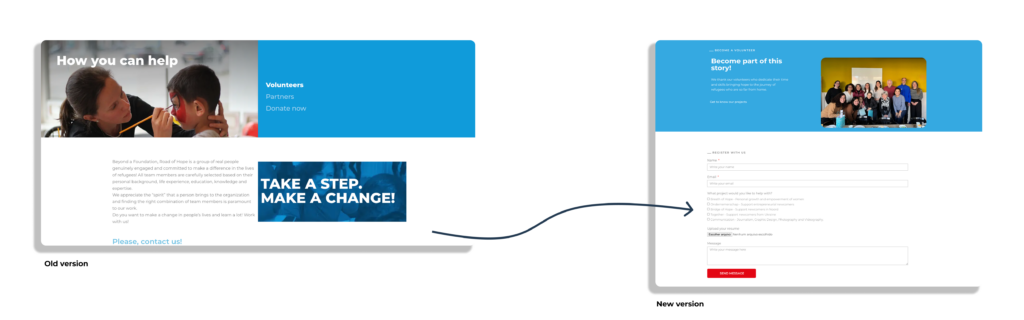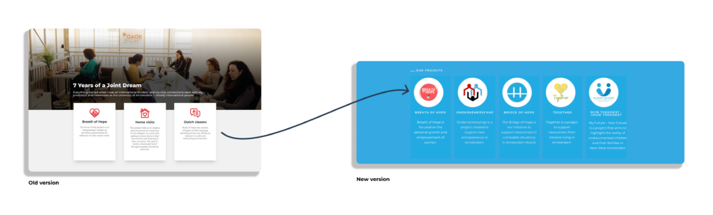 To present the organization’s projects, the old version had explanatory blocks, but they did not work as buttons, and the information was out of date. The solution incorporated all of Road of Hope’s projects, a brief explanation, and all of the logos are clickable and work, leading to the projects and more advanced information.